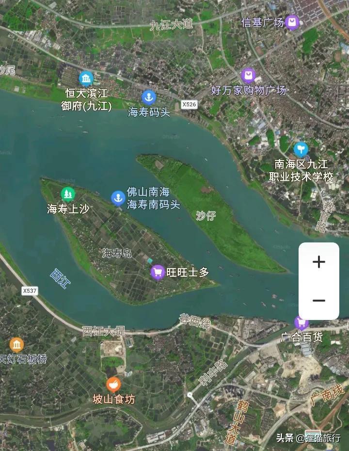 在广东省佛山市南海区有一个九江镇,这里有海寿码头,可以坐渡轮到达海寿岛,仅需几分钟时间。海寿岛位于九江镇与鹤山市之间的西江上,西江流经海寿岛时分成了北河道和南河道。泥沙在此淤积形成了一个扁长的江心岛,这就是海寿岛,也叫南岛。