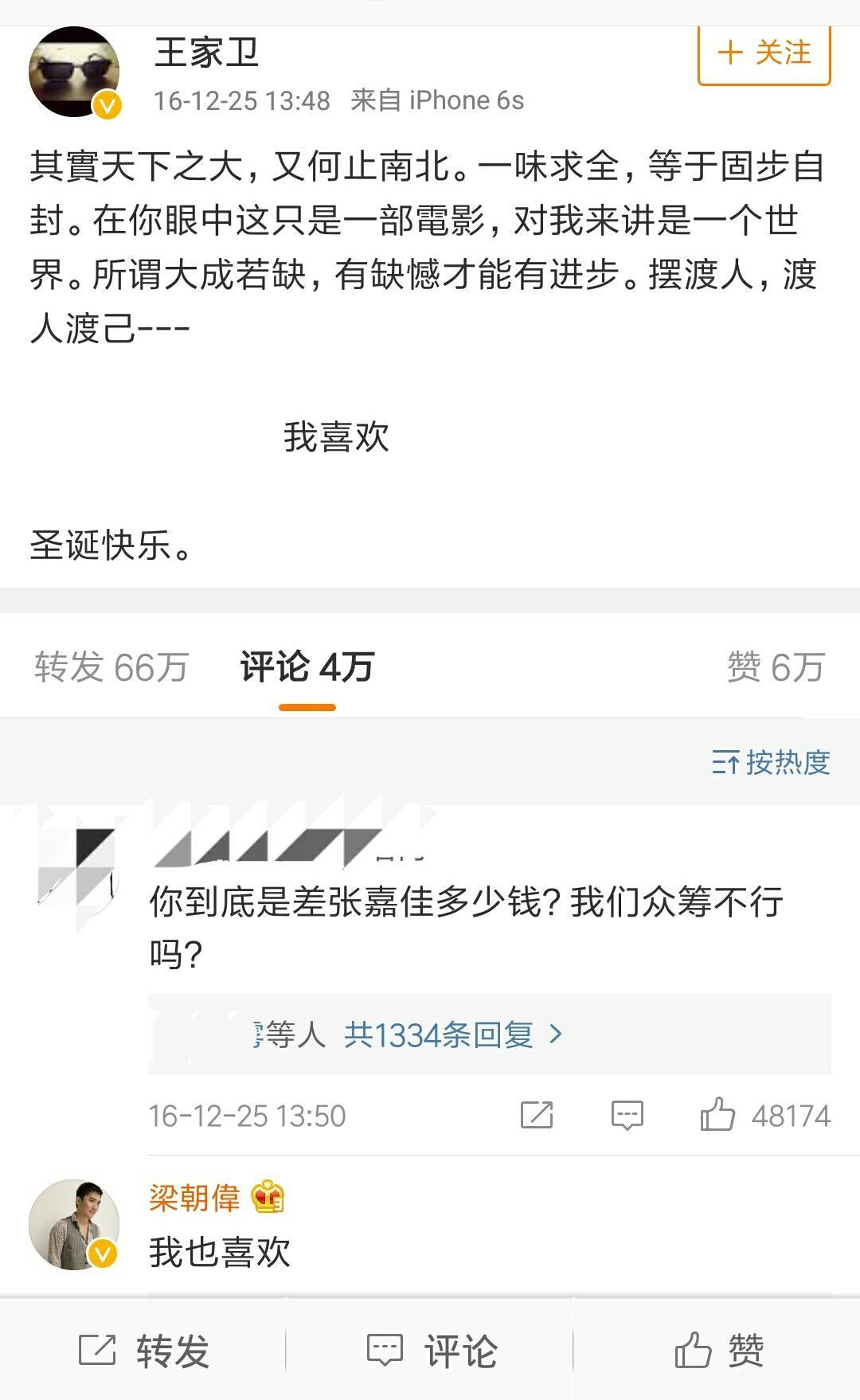 2016年电影《摆渡人》上映,王家卫在微博上盛赞这部电影,并称:“我喜欢”。随后,梁朝伟等各大明星纷纷转发,附和道:“ 我也喜欢”,只有关谷的扮演者王传君大胆提出反对意见,说“我不喜欢”。