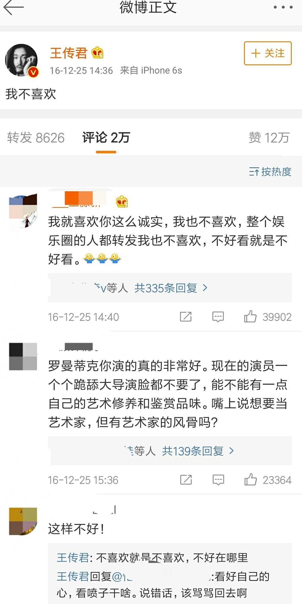 不得不说,王传君真是个耿直boy!图中粉丝还劝他说这样不好,他回答,不喜欢就是不喜欢。娱乐圈已经很少有这样实诚的人了!或许就是这样,他才得罪了不少人吧!