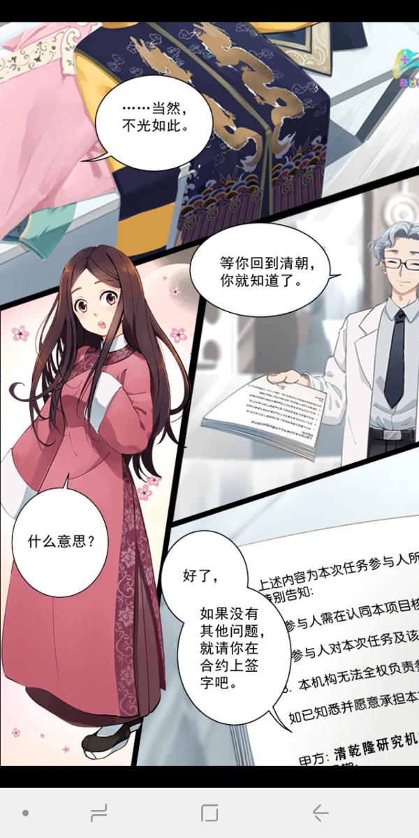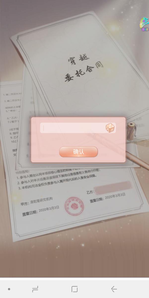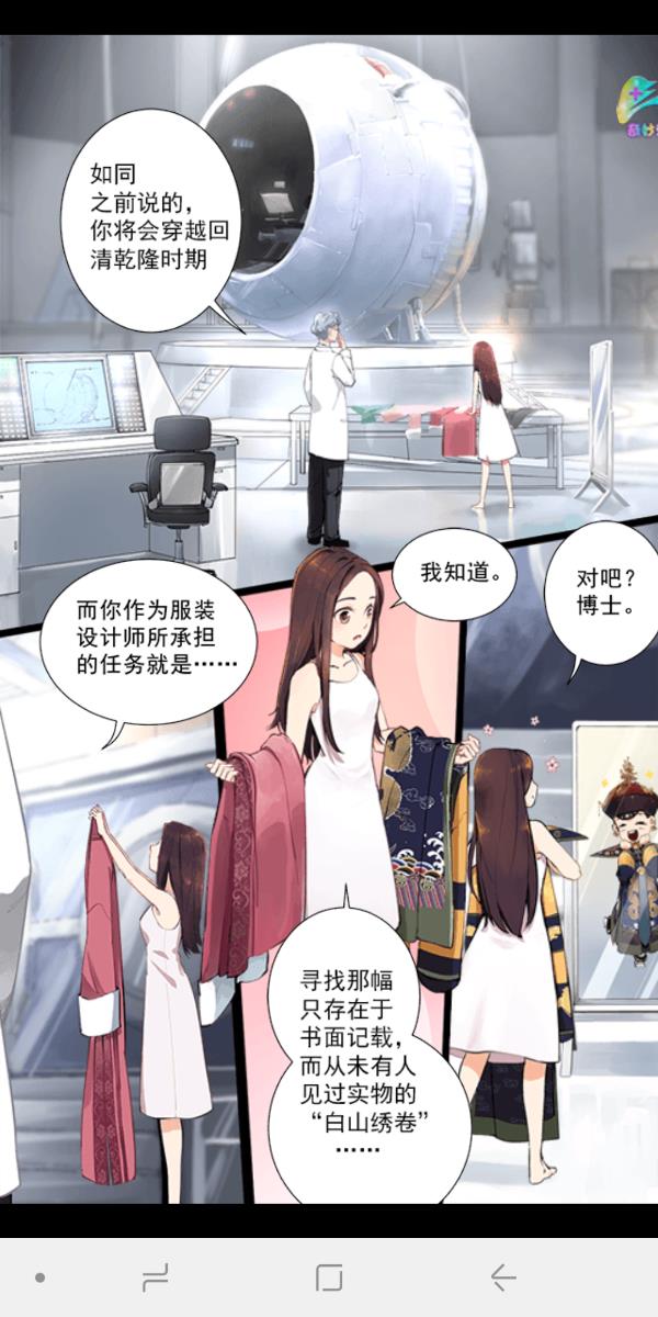 游戏一开始,角色设定为现代服装女设计师,跟博士签订协议,穿越回清朝乾隆年间,寻找白山绣卷。穿越合同上面会要求签字,也就是给自己游戏取一个名字。无论取什么名字,都不会影响剧情里面的名字,因为无论在现代叫什么,穿越回古代剧情里面一律叫陈婉君。如果实在想不出叫什么名字,也可以选择系统随机取名字。写好名字后点击确认开始旅程,游戏就正式开始了。