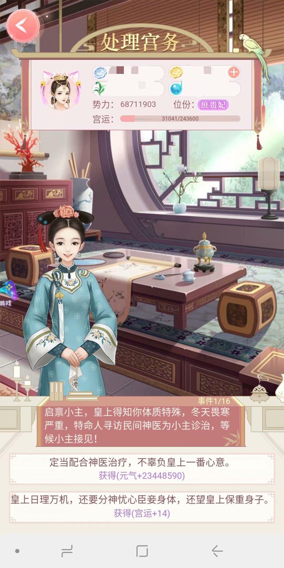 处理宫务的时候是需要选择的,上面一行随机出现银两,元气,草药和蓝颜礼物。看着是不是很诱人?但是千万不要点,记得点下面的宫运,否则你的位分会升的很慢。我现在是庶贵妃,所以处理一次宫务,宫运一次+14,这个是根据位分不同而不同,位分越高加的越多。半小时处理一次,位分越高,可以累计的次数越多。