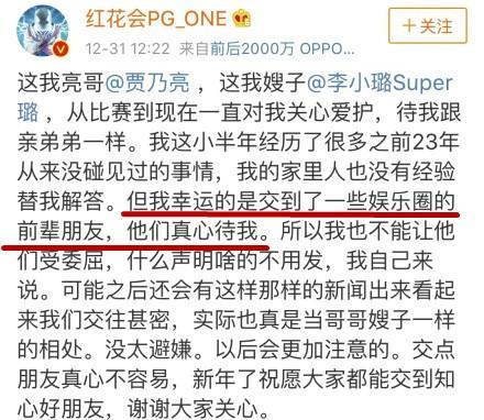 先抛开这件事情究竟是不是真,PG ONE在成名之后,迅速结交了一批娱乐圈的大佬这件事肯定是没错的。在他的回应里,什么娱乐圈前辈,璐姐、亮哥这样的称呼,可以看出,PG ONE这半年也没闲着,圈内的朋友真的没少结交。