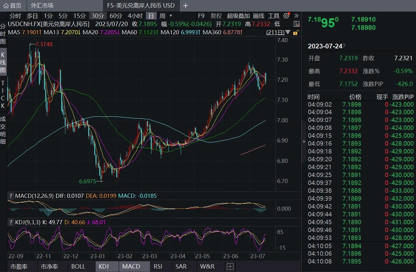 受此消息影响,7月20日离岸人民币对美元汇率日内涨超500个基点,收复7.18重要关口。