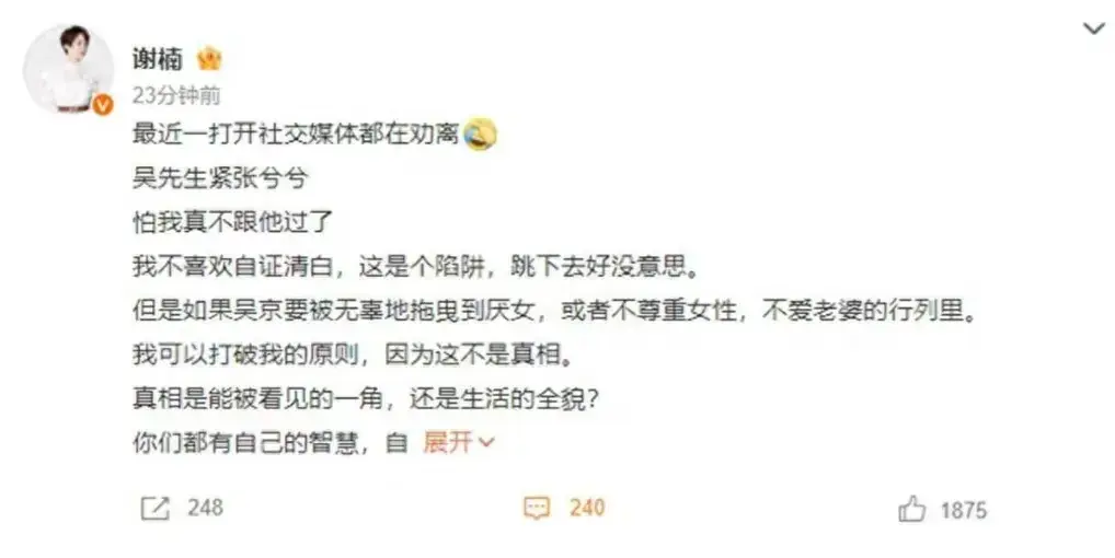 面对质疑和猜测,谢楠没有选择沉默。她迅速站出来为老公正名,通过社交媒体发表声明,坚决否认了关于吴京厌女、不尊重女性、不爱老婆等黑料。她强调夫妻间应相互信任和支持,不应受到无根据的言论的影响。