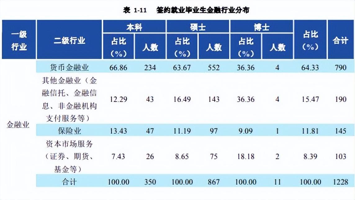 本科、硕士毕业生主要就业于金融业,博士毕业生主要就业于教育行业,比如大学老师。其中金融行业的就业数据中,占比66.86%的学生都选择了货币金融业,其次为金融信托,金融信息,非金融机构支付服务,保险业等。