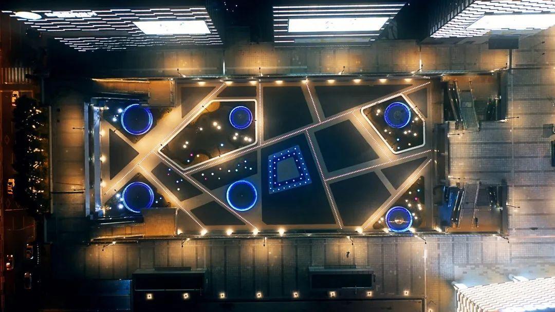 “门堂里”西下沉广场及小下层庭院“客堂间”作为江南人家“家”中的天井,适合接待客人。本次改造结合周边商业楼的提升,设置彩色绚丽、动态互动的灯光,打造温馨舒适、适合接待客人的“私家园林”。