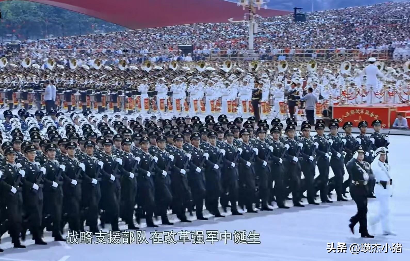 以2019年的阅兵仪式为例,战略支援部队方阵的2位少将领队分别身穿陆军和空军的军服,队员则身穿陆、海、空等多军种军服。