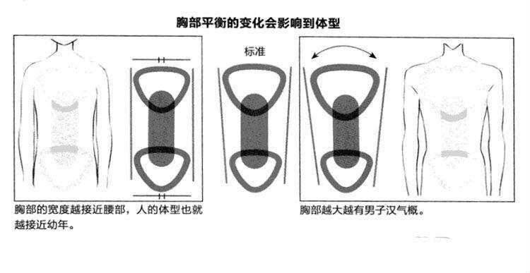如下图,胸部的宽度越接近腰部,人的体型也就越接近幼年。胸部越大越有男子汉气概。