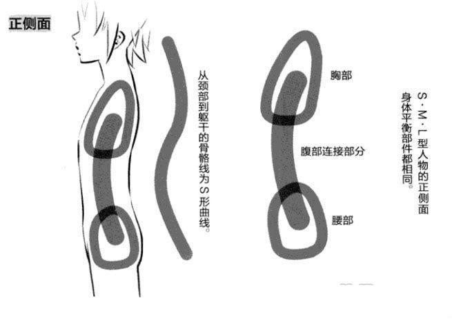 如下图,从颈部到躯干的骨骼线为S形曲线。