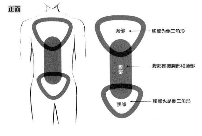 正面:身体平衡部件由“胸部”、“腰部”和连接这两部分的“腹部”三部分组成。1、胸部为倒三角形;2、腹部连接胸部和腰部;3、腰部也是倒三角形。