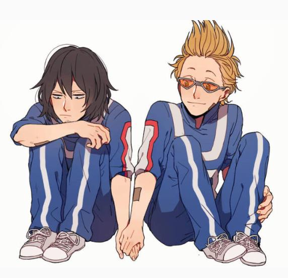 这对大概是cp感最差的一对了,感觉老外对于这种类型的cp跟国内有不少的差距。两人同为雄英的老师,学生时期还是同期的同学,这样看好像是有了点cp感,而且相泽消太的英雄名还是麦克给他起的,"橡皮头"对应个性消除的能力,还挺贴切的。