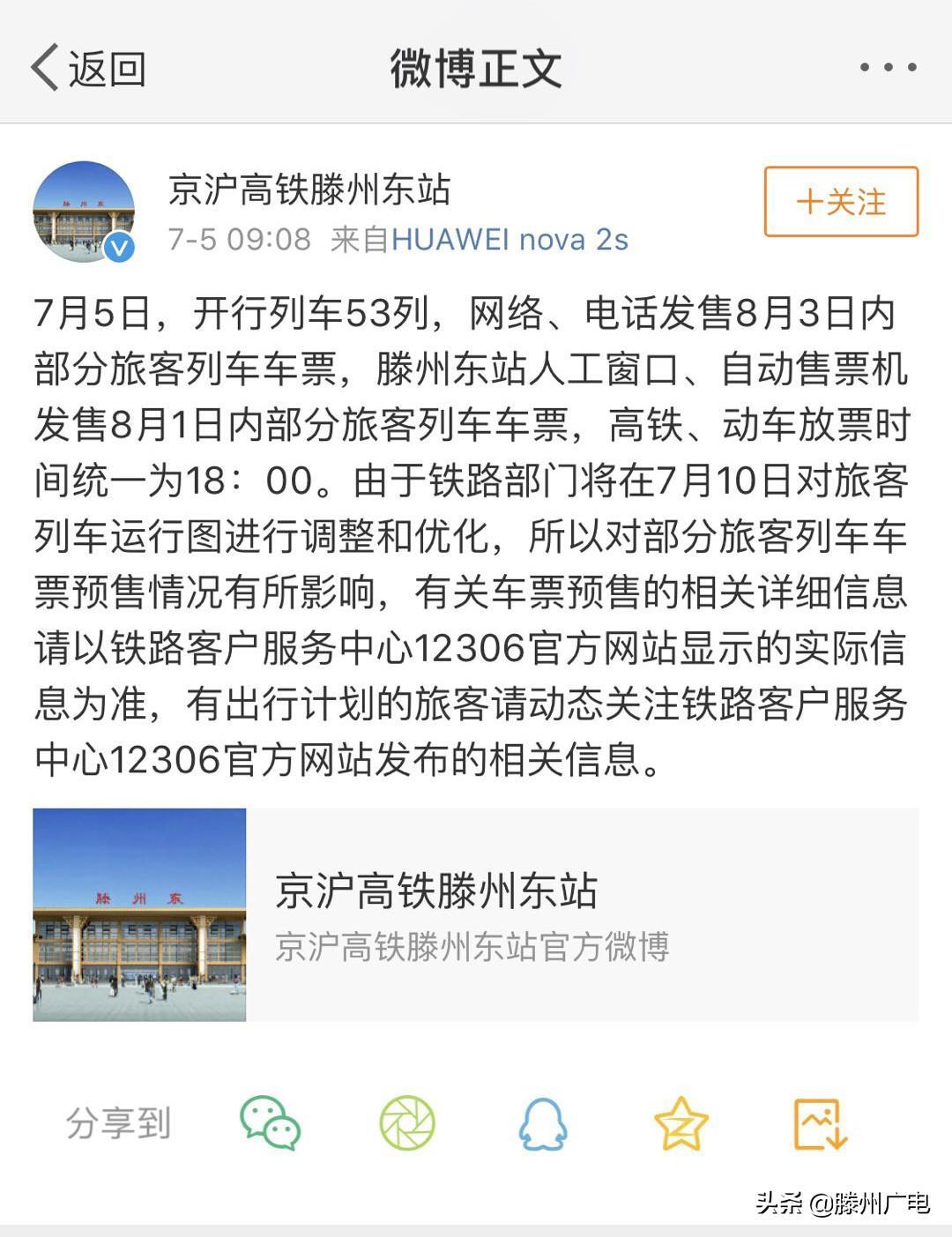 滕州广电讯:据京沪高铁滕州东站微博消息。7月5日,开行列车53列,网络、电话发售8月3日内部分旅客列车车票,滕州东站人工窗口、自动售票机发售8月1日内部分旅客列车车票,高铁、动车放票时间统一为18:00。由于铁路部门将在7月10日对旅客列车运行图进行调整和优化,所以对部分旅客列车车票预售情况有所影响,有关车票预售的相关详细信息请以铁路客户服务中心12306官方网站显示的实际信息为准,有出行计划的旅客请动态关注铁路客户服务中心12306官方网站发布的相关信息。